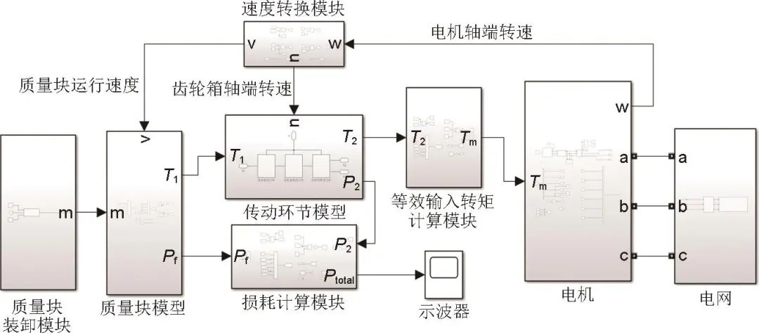 依據(jù)上文各環(huán)節(jié)損耗數(shù)學表達式及相應的能效計算方法,建立基于MATLAB/Simulink的TCS-GESS能效分析模型。首先,能效分析包括質量塊模型和傳動環(huán)節(jié)模型,與損耗計算模塊結合,可實現(xiàn)各環(huán)節(jié)損耗占比分析。其次,通過等效輸入轉矩計算模塊得到實際工況下的負載轉矩,將其輸入至電機模塊,實現(xiàn)重力儲能系統(tǒng)的工況模擬。最后,速度轉換模塊將電機軸端的角速度轉化成電機軸轉速與質量塊運行速度,反饋于各環(huán)節(jié)模型,實現(xiàn)動態(tài)閉環(huán)響應,如圖4所示,其中T1為質量塊等效轉矩,T2為經傳動環(huán)節(jié)后輸入至齒輪箱的轉矩,Tm為電機軸端轉矩,P2為經傳動機構后的損耗功率,Ptotal為系統(tǒng)功率損耗的總和。