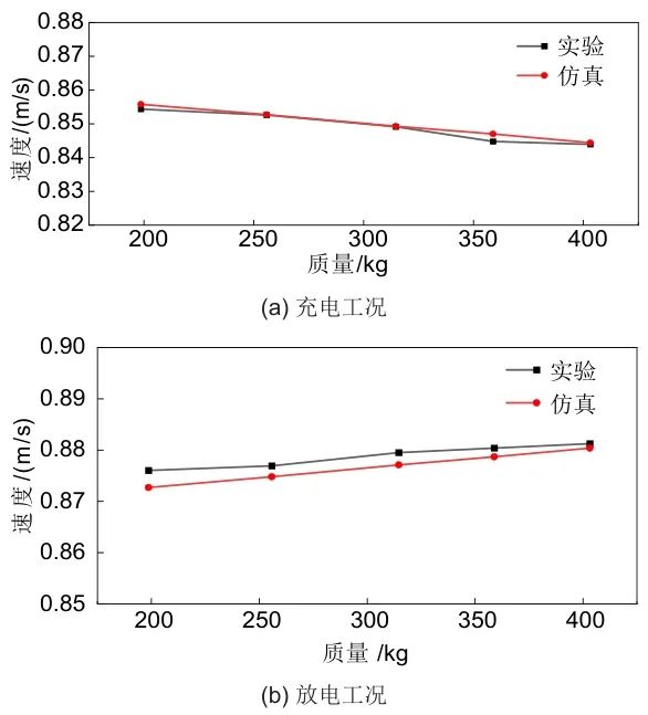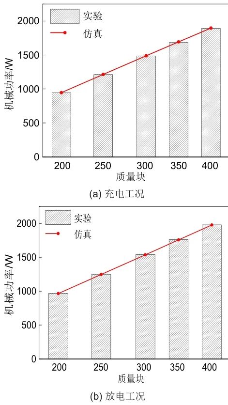 充電工況下,負載增加時,對應于質量塊質量增加,速度微弱減少,前者變化數(shù)量級遠大于后者,故整體呈現(xiàn)增大趨勢,如質量由314.65 kg增加至358.9 kg時,運行速度由0.84913 m/s減少至0.84479 m/s,質量變化功率增幅為209.31 W,速度變化功率衰減為7.61 W,故此過程中機械功率輸出增加;放電工況下,負載增加時,對應于質量塊質量增加,速度微弱增加,故整體呈現(xiàn)增大趨勢。