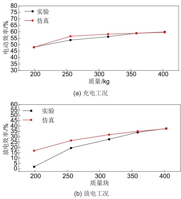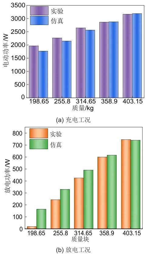 結果表明,輕載時受實驗環(huán)境及質量塊無法正常出力影響,系統(tǒng)樣機阻力較大,不可控損耗以電機損失電功率的形式承擔,工況波動造成傳動損耗較仿真有所增加,故導致實驗與仿真存在差異;在額定負載工況下,不可損耗占比變小且工況逐漸穩(wěn)定,從上述五個維度仿真結果與實測能效數(shù)據(jù)基本一致,且變化規(guī)律與前述理論吻合,驗證了能效分析模型的準確性與實用性。