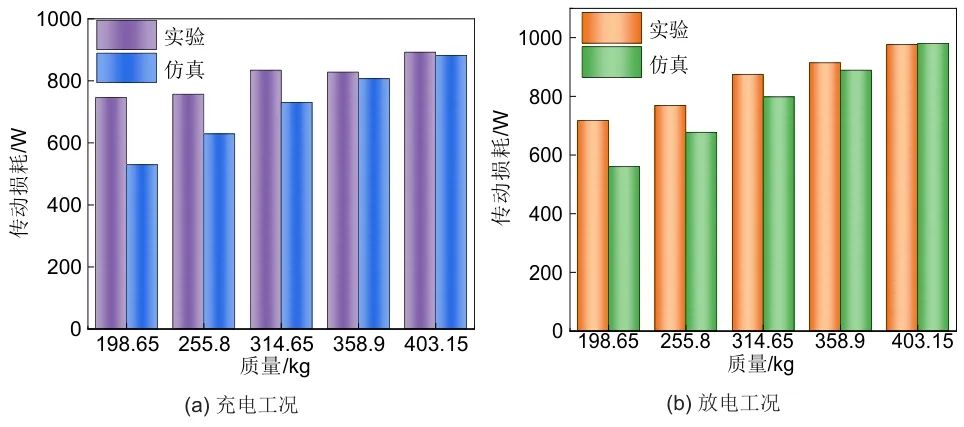 (1)推導了各環(huán)節(jié)損耗數(shù)學表達式及相應的能效計算方法,建立了基于MATLAB/Simulink的TCS-GESS能效分析模型。并設計了充放電工況下的TCS-GESS實驗方案,利用能效分析模型從速度、機械功率、充電/放電功率、傳動損耗以及電機損耗五個維度進行仿真,仿真結果與實測能效數(shù)據(jù)基本一致,驗證了能效分析模型的準確性與實用性。