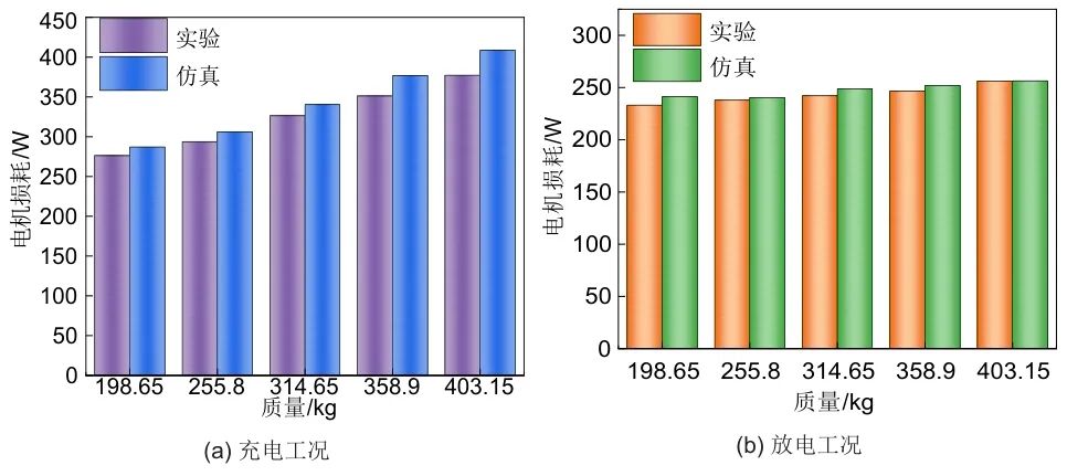 充電工況下,異步電機電功率以電動功率形式體現(xiàn),在數(shù)值上為機械功率與各類損耗功率之和,負載增加時,兩者均增加,故整體呈增大趨勢;放電工況下,異步電機電功率以放電功率形式體現(xiàn),在數(shù)值上為機械功率與各類損耗功率之差,負載增加時,前者增幅遠大于后者,故整體現(xiàn)增大趨勢,如質量由314.65 kg增加至358.9 kg時,機械功率增幅為218.534 W,各類損耗功率增幅為40 W,故此過程放電功率增加。