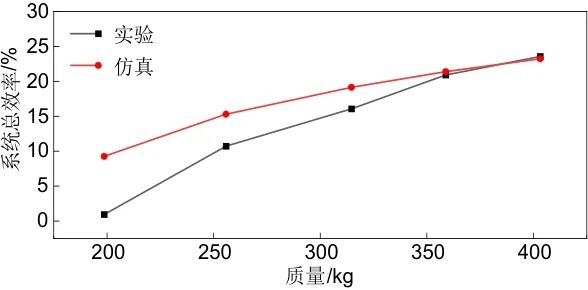 圖12為充放電工況下質量塊加載變化時系統(tǒng)總效率響應特性。系統(tǒng)總效率為上述放電功率與上述電動功率之比,其中傳動損耗與電機損耗在低負載時占比例較大,而在高負載時占比減少,故當負載增加時,系統(tǒng)總效率呈增大趨勢。