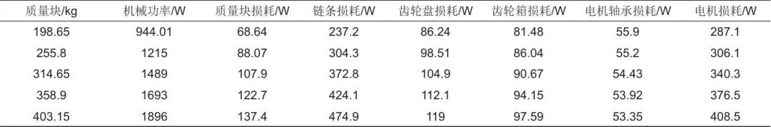 此處傳動損耗為系統(tǒng)中任何傳動環(huán)節(jié)所造成的損耗之和,包括了質量塊承載車與支撐軌道、傳送鏈各鏈節(jié)、傳送鏈與支撐板、傳送鏈與齒輪盤、齒輪箱及軸承之間的損耗;由式(1)和式(2)可得,前三者與質量塊質量及其運行速度呈正相關,隨負載增加而增加;由式(3)、式(9)及式(11)可得,后三者與電機轉速、扭矩呈正相關,隨負載增加而增加;故當負載增加時,傳動損耗整體呈增大趨勢。電機損耗包括可變損耗和不可變損耗兩部分,由式(10)可得,可變損耗隨負載增加而增加。