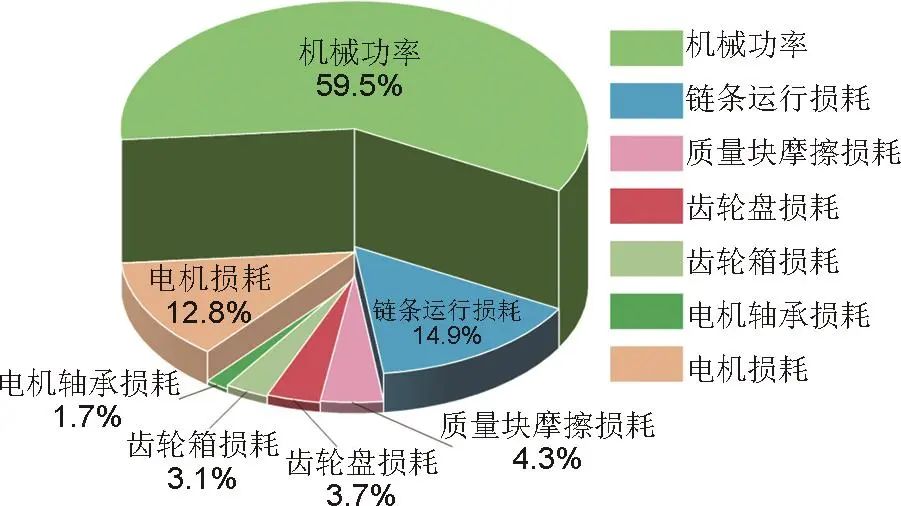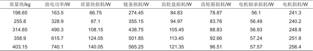 在不同負載條件下,基于能效分析模型進一步分析可得充電工況下各損耗模塊占比情況,見表1,其中圖13為額定充電工況下各損耗占比。結果表明,在整個系統(tǒng)損耗中鏈條運行損耗占比較大,且隨著逐漸加載的過程中,損耗增幅較大。與轉速直接相關的齒輪箱和齒輪盤損耗變化不大且占比較小。電機損耗占比中等,且隨負載增加而增加,變化規(guī)律與前述理論分析吻合。隨著質量塊不斷加載,系統(tǒng)充電效率逐漸提高,額定工況下可達59.5%。