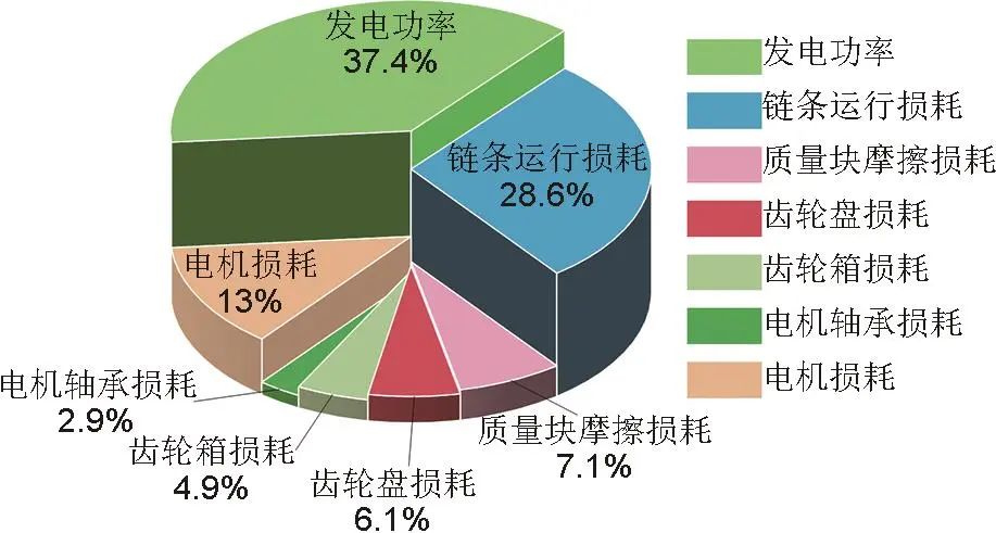 在不同負載條件下,基于能效分析模型展開進一步分析,得放電工況下各損耗模塊占比情況,見表2,其中圖14為額定工況下各損耗百分比占比。結果表明,在整個系統(tǒng)損耗中鏈條運行損耗占比較大,且隨著逐漸加載的過程中,損耗增幅較大。與轉速直接相關的齒輪箱和齒輪盤損耗變化不大且占比較小。電機損耗占比中等,隨動力增加而增加,變化規(guī)律與前述理論分析吻合。隨著質量塊不斷加載,系統(tǒng)放電效率逐漸提高,額定工況下可達37.4%。
