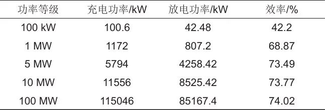 利用本模型對具有相同傳動機構、不同功率等級下的重力儲能系統(tǒng)充放電效率進行預測,分別以100 kW、1 MW、5 MW、10 MW、100 MW為例。充放電功率均對應同等質量下的質量塊進行仿真,結果見表3??梢钥闯觯孰S著重力儲能系統(tǒng)功率等級的提升而增加,但是當功率等級進一步提升時,系統(tǒng)效率增益較弱,故通過仿真結果得到的變化規(guī)律與前述理論分析吻合。
