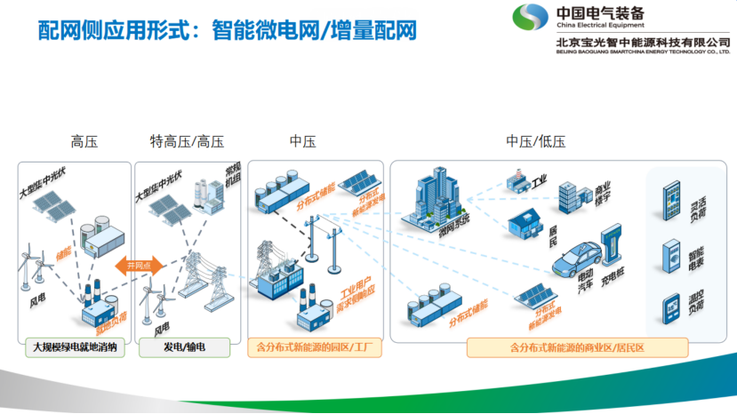 2.配網(wǎng)側(cè):主要面向園區(qū)、工廠、居民區(qū)及商業(yè)區(qū)等分布式場(chǎng)景,其特點(diǎn)是具有海量分散的負(fù)荷和被控對(duì)象,這與電源側(cè)集中式控制模式存在本質(zhì)差異。系統(tǒng)架構(gòu)基于公共通信網(wǎng)絡(luò)構(gòu)建,采用全新的控制策略來(lái)應(yīng)對(duì)分布式能源的復(fù)雜管理需求,重點(diǎn)解決智慧能源監(jiān)控、虛擬電廠協(xié)調(diào)控制、智能運(yùn)維及智能配電等核心問(wèn)題。該解決方案與增量配網(wǎng)和虛擬電廠深度結(jié)合,其功能架構(gòu)同樣包含監(jiān)控、優(yōu)化控制和運(yùn)維等模塊,但針對(duì)配網(wǎng)特性進(jìn)行了專(zhuān)門(mén)設(shè)計(jì)。通過(guò)分布式控制算法和邊緣計(jì)算技術(shù),實(shí)現(xiàn)對(duì)海量分布式資源的精準(zhǔn)管控,形成與電源側(cè)集中式管理相互補(bǔ)充的完整能源管理體系,為配網(wǎng)側(cè)的清潔能源高效利用提供技術(shù)支撐。