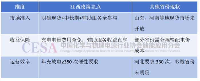 對比全國各省儲能政策,江西新政在市場化深度、收益保障和運(yùn)營效率三方面表現(xiàn)尤為亮眼,具體見下表: