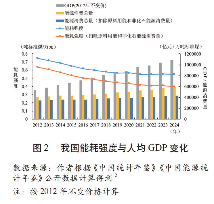十八大以來,我國深入推動能源安全新戰(zhàn)略,即能源消費革命、能源供給革命、能源技術(shù)革命、能源體制革命,全方位加強國際合作,能源效率實現(xiàn)大幅提升。2012年至2023年,我國以年均不到3.3%的能源消費增速支撐了年均超6.1%的經(jīng)濟增長,能耗強度實現(xiàn)持續(xù)下降(見圖2)。一方面,非化石能源替代大大釋放了用能空間,在有效控制化石能源消費的基礎(chǔ)上實現(xiàn)了經(jīng)濟產(chǎn)出的增長,2024年我國能耗強度(扣除原料用能和非化石能源消費)較2012年累計下降近37.74%。另一方面,作為原料使用的化石能源占比不斷提升。2022年,我國化石能源消費量較“十三五”末增加2.67億噸標(biāo)準(zhǔn)煤,其中作為化工原料使用的增量占比達到36.41%,較“十三五”提高近9個百分點,較“十二五”提高近14個百分點。2023年,受原料用能減少影響,作為燃料使用的化石能源的增量貢獻率回升明顯,但占能源消費總量比重仍較2012年下降了近4個百分點。這兩組數(shù)據(jù)表明我國在促進能源效率提升的同時,也推動了能源結(jié)構(gòu)的綠色低碳轉(zhuǎn)型,有效緩解了碳達峰碳中和目標(biāo)對經(jīng)濟發(fā)展能源需求的約束壓力。