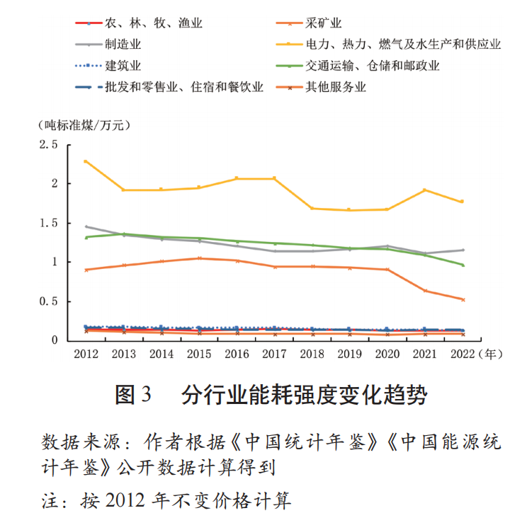 受生產(chǎn)方式、技術(shù)工藝和產(chǎn)品特性等因素影響,不同行業(yè)的能耗強度存在明顯差異,把握這些行業(yè)特征才能在推進重點領(lǐng)域綠色低碳轉(zhuǎn)型的過程中做到有的放矢。根據(jù)能源統(tǒng)計的行業(yè)劃分,以及各行業(yè)能耗強度平均水平和變化趨勢,可將八個行業(yè)按能源生產(chǎn)率高低劃分為低產(chǎn)出效益行業(yè)和高產(chǎn)出效益行業(yè)兩類(見圖3),其中電力、熱力、燃氣及水生產(chǎn)和供應(yīng)業(yè),制造業(yè),交通運輸、倉儲和郵政業(yè),采礦業(yè)四部門屬于低產(chǎn)出效益行業(yè);建筑業(yè)、批發(fā)和零售業(yè)、住宿和餐飲業(yè)、其他服務(wù)業(yè)屬于高產(chǎn)出效益行業(yè)。2022年,八個行業(yè)能耗強度較2012年均有明顯下降,按降幅由高到低依次為采礦業(yè),其他服務(wù)業(yè),建筑業(yè),交通運輸、倉儲和郵政業(yè),電力、熱力、燃氣及水生產(chǎn)和供應(yīng)業(yè),制造業(yè),批發(fā)和零售業(yè)、住宿和餐飲業(yè),農(nóng)、林、牧、漁業(yè)。按能耗強度降低的絕對值排名,由高到低依次為電力、熱力、燃氣及水生產(chǎn)和供應(yīng)業(yè),采礦業(yè),交通運輸、倉儲和郵政業(yè),制造業(yè),建筑業(yè),其他服務(wù)業(yè),批發(fā)和零售業(yè)、住宿和餐飲業(yè),農(nóng)、林、牧、漁業(yè)。結(jié)合各行業(yè)能源消費規(guī)模來看,十八大以來,我國能耗強度的下降主要得益于能源消費占比較高的制造業(yè)的能耗強度下降,以及低能耗強度的其他服務(wù)業(yè)能源消費占比的提升。