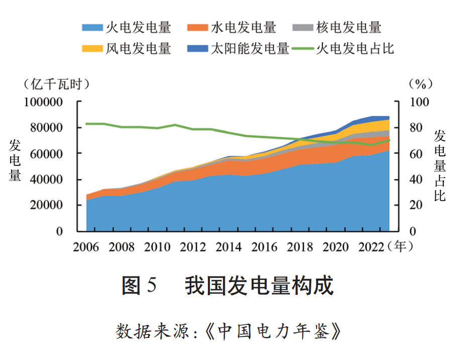 當(dāng)前,我國已基本形成了煤炭、石油、天然氣、可再生能源等多元能源供給體系。煤炭占一次能源消費比重由2011年的70.2%降至2023年的54.5%,天然氣、水電、核電、風(fēng)電、太陽能發(fā)電等清潔能源消費占比提升至26.1%,但煤炭占一次能源消費比重占比仍在50%以上。從電力結(jié)構(gòu)看(見圖5),近15年來盡管燃煤發(fā)電量在全部發(fā)電量中的比重持續(xù)保持下降趨勢,但在2022年仍然占據(jù)66.55%,我國能源結(jié)構(gòu)偏煤高碳特征依舊明顯。