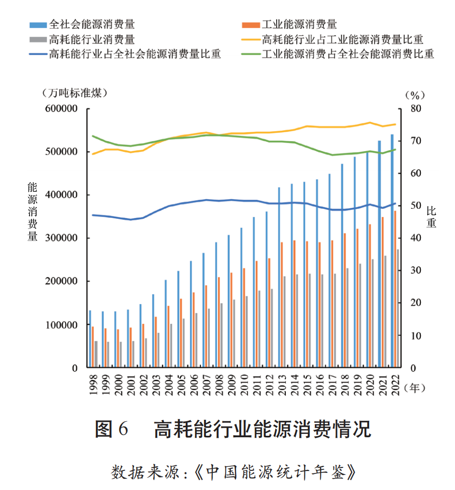 改革開放以來,我國經(jīng)濟實現(xiàn)歷史性跨越,能源消費需求持續(xù)上升。特別是加入世界貿(mào)易組織WTO后,我國商品市場、貨物市場、投資市場向世界開放,能源密集型工業(yè)生產(chǎn)的投資快速增加,能源消費進入高速增長階段。2002~2005年僅四年時間,我國能源消費增量便已超過1978~2001年共23年的增量總和?!笆晃濉币詠恚覈群筇岢龉?jié)能降耗量化目標(biāo)和“能源革命”重大戰(zhàn)略思想,實行能源消耗總量和強度“雙控”行動,能源消費增勢有所減緩,增速從2011年的7.32%逐步回落至2015年的1.35%。但全球新一輪科技革命和產(chǎn)業(yè)變革的不斷推進,拉動能源消費需求急劇增加,能源消費增速開始回升。2024年,我國能源消費總量已達59.6億噸標(biāo)準(zhǔn)煤,“十四五”前四年能源消費總量年均增速達4.58%,高出整個“十三五”時期能源消費年均增速1.78個百分點。