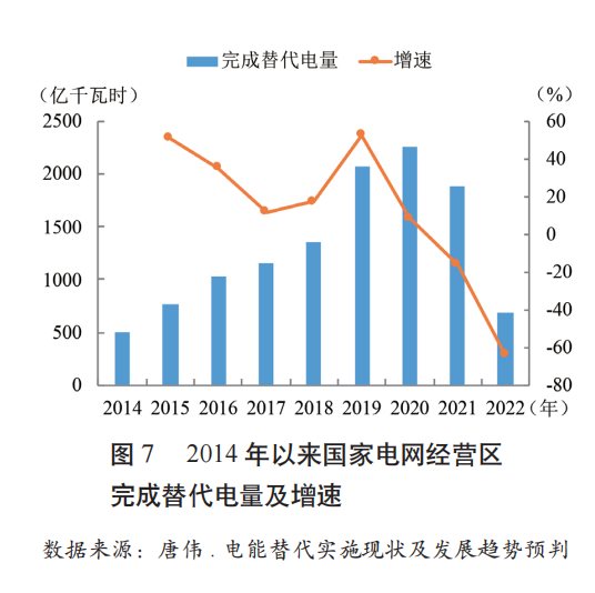 電能替代是提高全社會電氣化水平、改善居民生活質(zhì)量、提升社會生產(chǎn)效率、緩解能源碳排放的重要途徑。據(jù)測算[10] ,電能在終端能源消費中的占比每提高1個百分點,我國單位GDP能耗就可下降2個百分點~4個百分點。自電能替代工作全面啟動以來,電鍋爐、港口岸電、電動汽車等電能替代技術(shù)不斷發(fā)展成熟并推廣應(yīng)用,國家發(fā)展和改革委員會、國家能源局、生態(tài)環(huán)境部等部門先后出臺多項政策為電能替代提供有序指引,我國電能占終端能源消費比重穩(wěn)步增長,2012年電能占終端能源消費比重為19.3%,2023年這一比例上升至28%,累計提高近9個百分點。但近年來我國電能替代增速開始放緩,從國家電網(wǎng)經(jīng)營區(qū)替代電量變化來看[11] (見圖7),2014至2020年,實施替代電量由503億千瓦時迅速增加至2252億千瓦時,年均增速達28.38%,隨后一路下降,2022年完成替代電量僅為684億千瓦時,年均增速-81.45%。技術(shù)和經(jīng)濟是制約再電氣化縱深推進的兩個主要因素。技術(shù)方面,一是風(fēng)電、光伏等發(fā)電的波動性和不穩(wěn)定性,以及儲能技術(shù)的成本和效率問題等,導(dǎo)致電源側(cè)電能供應(yīng)清潔化水平不足[12] 。增容技術(shù)尚未完全成熟,電網(wǎng)擴容難度較大,導(dǎo)致電網(wǎng)側(cè)應(yīng)對用電負荷快速增長面臨較大壓力。二是電能替代的各項技術(shù)或設(shè)備的技術(shù)經(jīng)濟性仍然偏低,導(dǎo)致用戶側(cè)電能替代意愿不夠積極。此外,產(chǎn)品標(biāo)準(zhǔn)的缺失也使得產(chǎn)品和服務(wù)質(zhì)量難以得到有效保障。