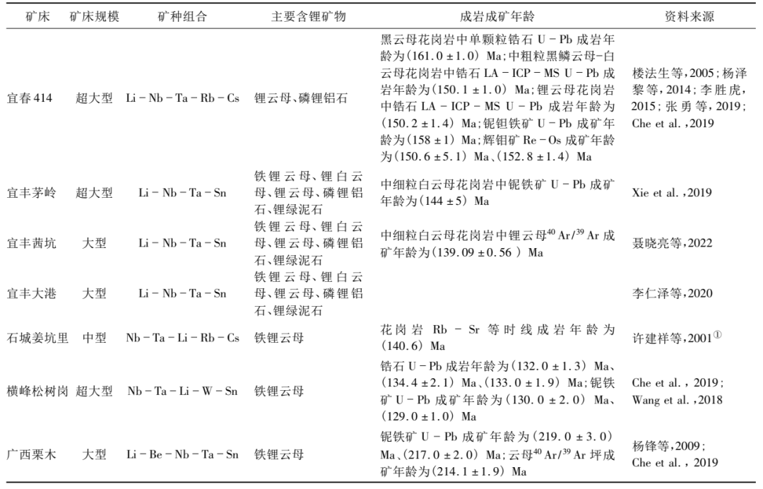 江西典型花崗巖云母型鋰礦主要集中于武功山、九嶺南緣及靈山礦集區(qū),代表性礦床有宜春 414鉭鈮鋰礦床、橫峰松樹崗鉭鈮鋰礦床,兩者均為超大型花崗巖型鋰礦床。九嶺南緣的宜豐同安—白水洞鋰礦田為超大型花崗巖云母型鋰礦床聚集地。
