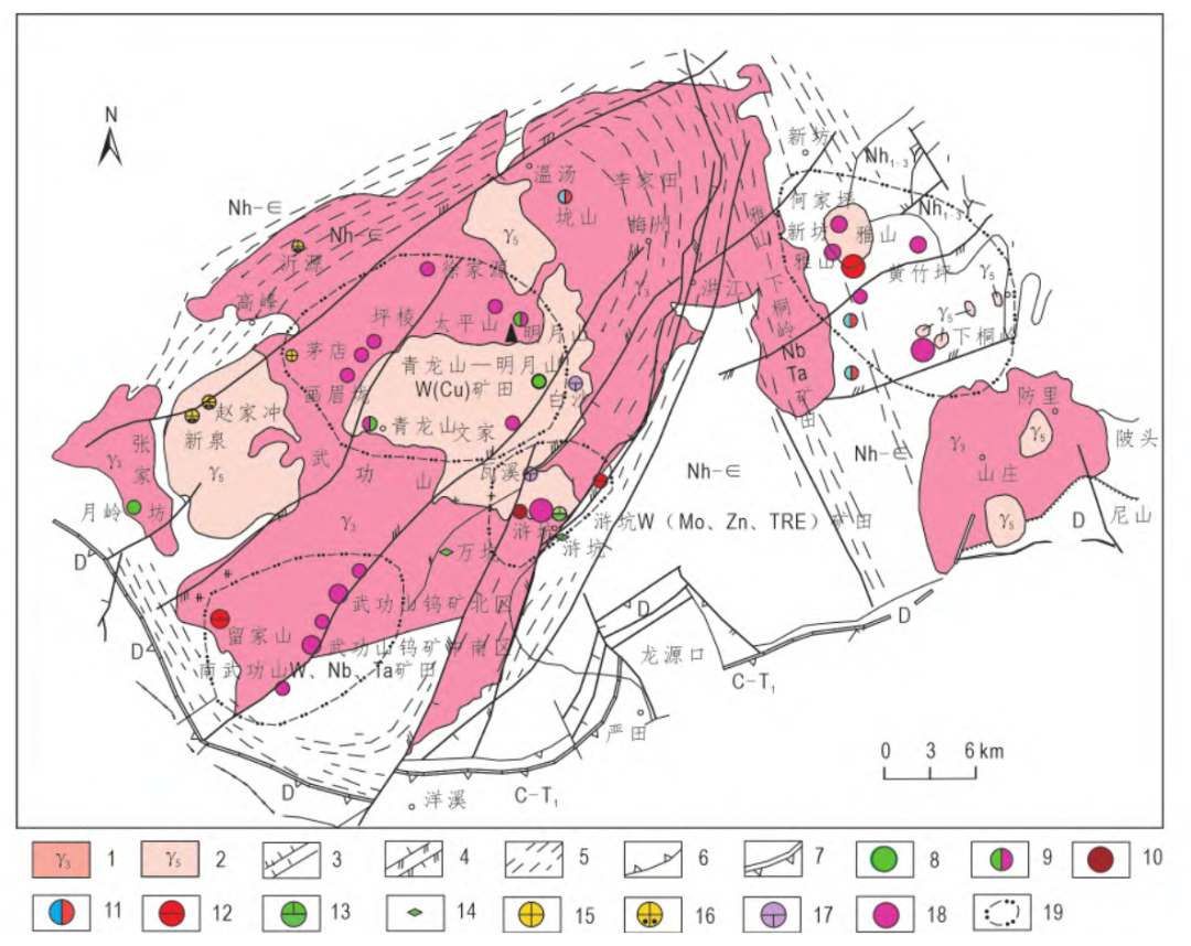 1.加里東期花崗巖; 2.燕山期花崗巖; 3.正、逆斷層; 4.壓、張扭性斷層; 5.韌性剪切帶; 6.滑脫斷層; 7.花崗巖穹窿構(gòu)造; 8.銅礦;9.鎢銅礦; 10.鋅礦; 11.鉛鋅礦;12.鈮鉭礦;13.鈹、鋰礦; 14.含鋰瓷石礦;15.巖金礦;16.砂金礦;17.稀土礦;18.鎢礦;;19.礦田范圍;CT1.石炭系下三疊統(tǒng);D.泥盆系;Nh-€ .南華寒武系;Nh1-3Y.南華系楊家橋群。