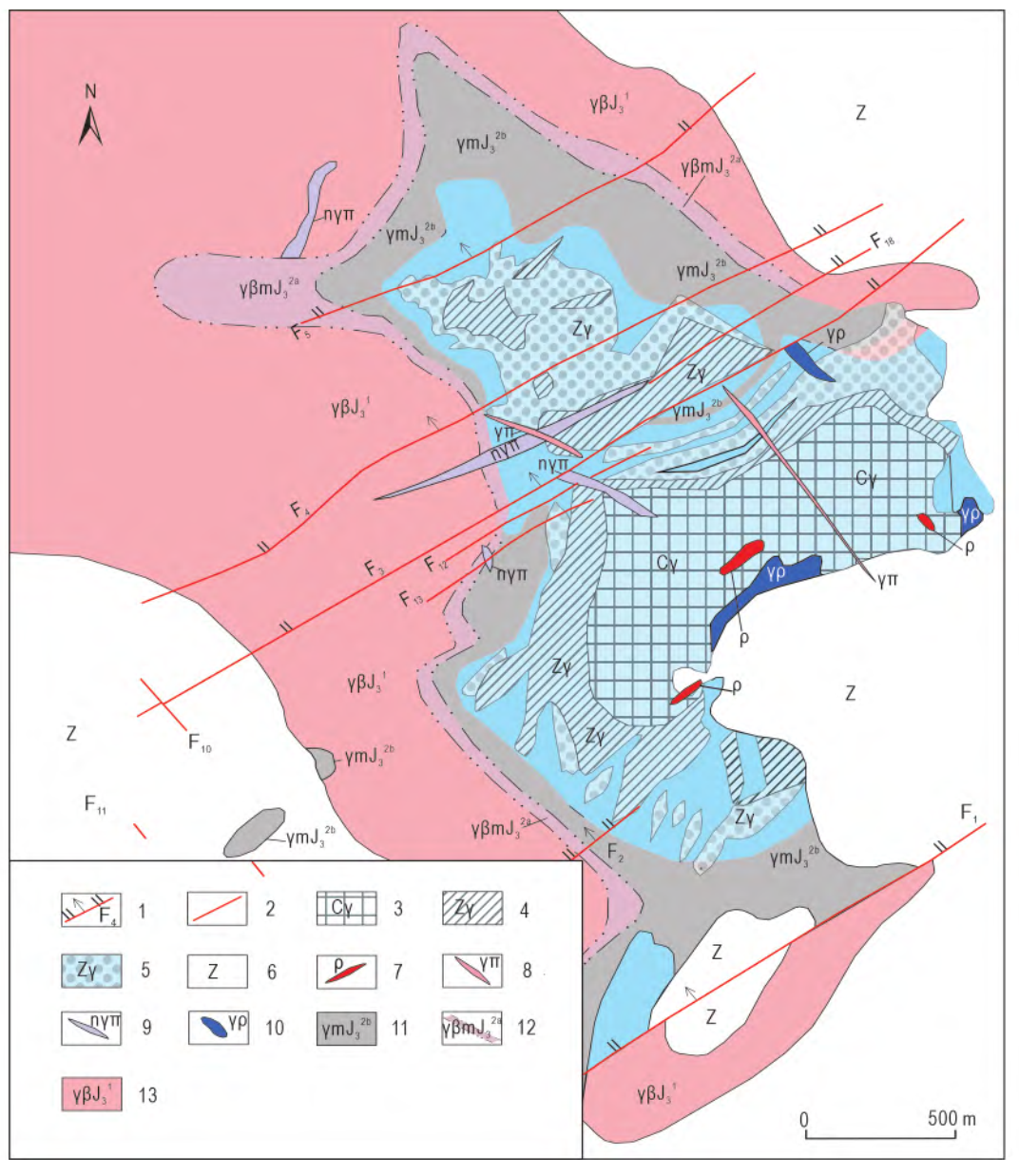 1.正斷層; 2.性質(zhì)不明斷層; 3.強(qiáng)鈉化高品位鉭鈮鋰礦體; 4.中鈉化貧鉭鈮鋰礦體; 5.弱鈉化二級貧鉭鈮鋰礦體; 6.震旦系淺變質(zhì)巖;7.似偉晶巖; 8.花崗斑巖脈; 9.鈉長石化花崗斑巖脈; 10.偉晶巖殼; 11.弱鈉長石化晚侏羅世白云母花崗巖;12.晚侏羅世二云母花崗巖;13.晚侏羅世黑云母花崗巖。