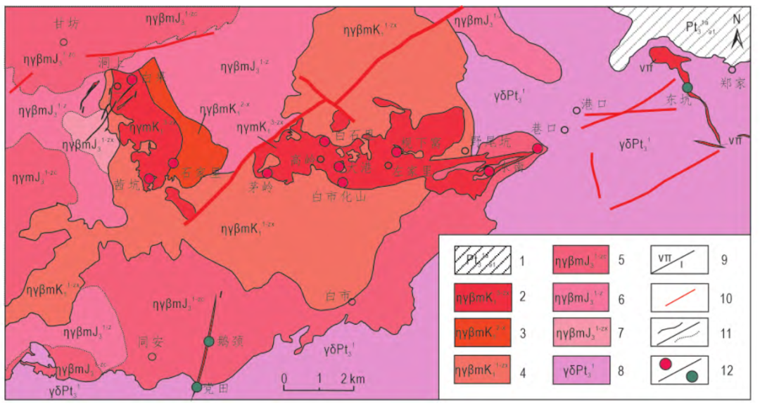 1.雙橋山群安樂林組變凝灰質(zhì)細(xì)砂巖; 2.白水洞巖體中細(xì)粒白云母二長花崗巖; 3.武堂巖體細(xì)粒二云母二長花崗巖; 4.古陽寨巖體中細(xì)粒含斑二云母二長花崗巖; 5.甘坊巖體中粗粒斑狀二云母二長花崗巖; 6.甘坊巖體中粒斑狀二云母二長花崗巖; 7.甘坊巖體中細(xì)粒斑狀二云母二長花崗巖;8.九嶺巖體花崗閃長巖;9.霏細(xì)斑巖脈/ 細(xì)晶巖脈;10.斷裂; 11.地質(zhì)界線/ 巖相界線; 12.蝕變花崗巖型/ 細(xì)晶巖型礦床。
