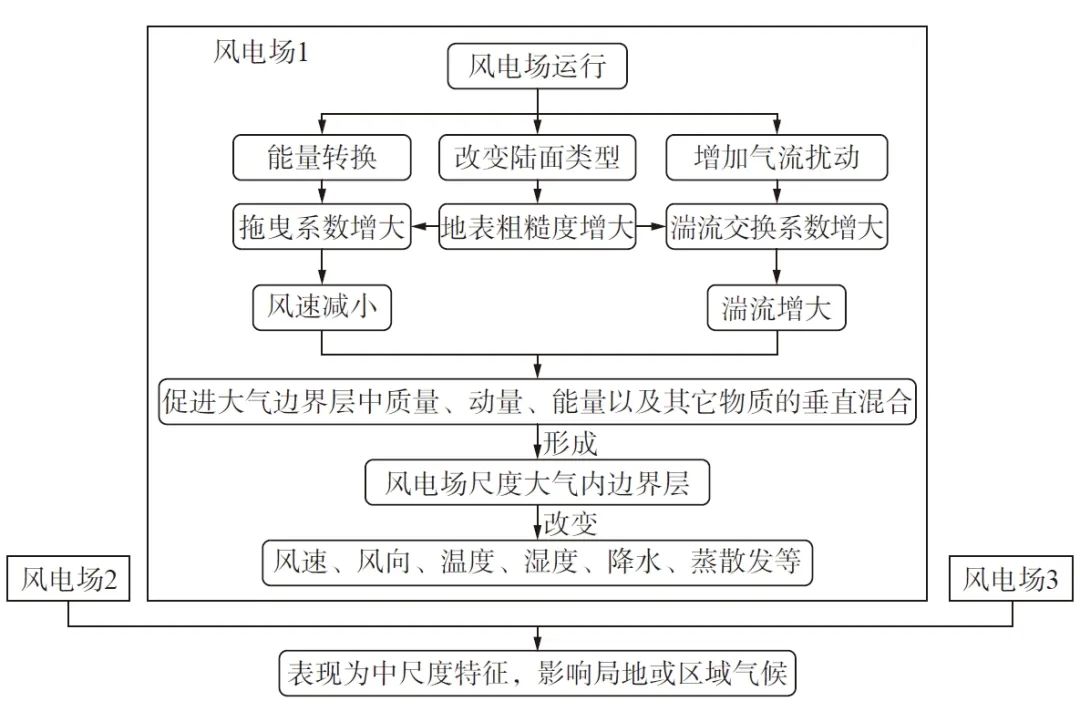 風(fēng)電機(jī)組運(yùn)行過(guò)程中,其旋轉(zhuǎn)吸收風(fēng)能的同時(shí),增加了區(qū)域內(nèi)地表粗糙度,并對(duì)氣流增加了擾動(dòng)作用,表現(xiàn)出“低風(fēng)速、高湍流”的尾流效應(yīng),促進(jìn)大氣邊界層中質(zhì)量、動(dòng)量、能量以及其它物質(zhì)的垂直混合。經(jīng)過(guò)若干風(fēng)電機(jī)組群的尾流疊加效應(yīng),即形成風(fēng)電場(chǎng)尺度的大氣內(nèi)邊界層,當(dāng)其充分發(fā)展時(shí),可對(duì)風(fēng)電場(chǎng)下游幾十公里范圍內(nèi)產(chǎn)生干擾作用。尾流效應(yīng)的量級(jí)和距離受風(fēng)電場(chǎng)的大小影響的同時(shí),還和大氣邊界層的穩(wěn)定性有關(guān)。研究表明,在大氣中性層結(jié)條件下,風(fēng)電場(chǎng)尾流距離可以表示為風(fēng)電機(jī)組直徑、高度、行數(shù)、列間距、動(dòng)能利用系數(shù)和地表粗糙度的函數(shù)。隨著大規(guī)模風(fēng)電基地的開(kāi)發(fā),風(fēng)電場(chǎng)尾流效應(yīng)可呈現(xiàn)出中尺度特征,影響局地或區(qū)域大氣物理過(guò)程,進(jìn)而產(chǎn)生局地或區(qū)域氣候效應(yīng),影響機(jī)理如下圖所示:
