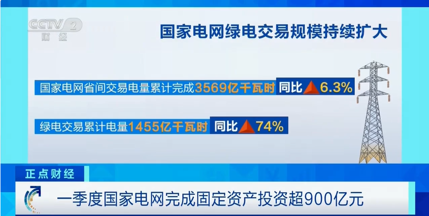 從國(guó)家電網(wǎng)公司獲悉,一季度國(guó)家電網(wǎng)經(jīng)營(yíng)區(qū)固定資產(chǎn)投資規(guī)模創(chuàng)歷史同期最高水平,綠電交易累計(jì)電量同比增長(zhǎng)74%。