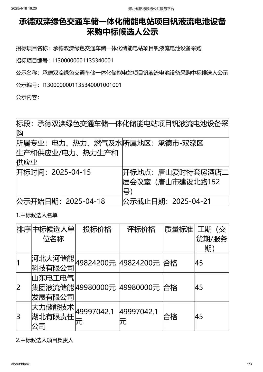 中國(guó)儲(chǔ)能網(wǎng)訊:4月18日,承德雙灤綠色交通車(chē)儲(chǔ)一體化儲(chǔ)能電站項(xiàng)目釩液流電池設(shè)備采購(gòu)中標(biāo)候選人公示發(fā)布。