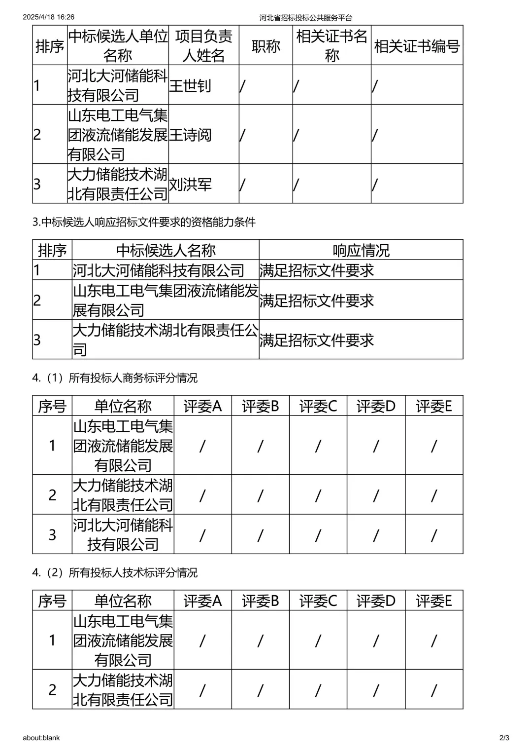 中標(biāo)候選人第1名:河北大河儲(chǔ)能科技有限公司,投標(biāo)價(jià)格:49824200元,折合單價(jià):2.491元/Wh;