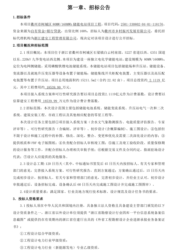 中國(guó)儲(chǔ)能網(wǎng)訊:4月17日,衢州市鄉(xiāng)村振興發(fā)展有限公司發(fā)布衢州市柯城區(qū)80MW/160MWh儲(chǔ)能電站項(xiàng)目工程設(shè)計(jì)招標(biāo),項(xiàng)目總投資約2.1119億元,約合1.32元/Wh。