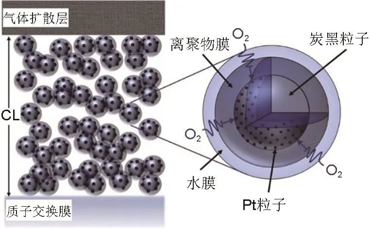 PEMFC在運(yùn)行過(guò)程中會(huì)發(fā)生質(zhì)量傳遞、熱量傳遞、電化學(xué)反應(yīng)、離子傳輸和電子傳輸?shù)雀鞣N相互關(guān)聯(lián)活動(dòng),其核心部件是膜電極組件(membrane electrode assembly, MEA),PEMFC的運(yùn)行效率和性能主要取決于MEA的結(jié)構(gòu)與組成,而后者在很大程度上由其中催化層(catalyst layers, CLs)的結(jié)構(gòu)特征所決定,尤其是發(fā)生氧還原反應(yīng)(oxygen reduction reaction, ORR)的陰極催化層部分(cathode catalyst layer, CCL)。CCL一般是厚度小于10 μm的隨機(jī)多孔結(jié)構(gòu),由Pt納米粒子、碳載體顆粒、離聚物(Ionomer)和孔隙構(gòu)成。如圖1所示,Pt納米粒子不僅分布在碳載體顆粒的外表面,也分布在碳載體顆粒內(nèi)部初級(jí)孔內(nèi),而Pt/C顆粒形成的團(tuán)聚體周圍通常被離聚物膜所包覆,團(tuán)聚體之間又會(huì)形成由次級(jí)孔構(gòu)成的復(fù)雜多孔網(wǎng)絡(luò)[3-4]。當(dāng)PEMFC運(yùn)作時(shí),由離聚物傳導(dǎo)的質(zhì)子與從CCL曲折孔道結(jié)構(gòu)擴(kuò)散的O2相遇,一起在催化劑Pt納米粒子表面發(fā)生ORR反應(yīng),因同時(shí)涉及氣(如O2)、液(如離聚物和水)、固(如Pt粒子和碳載體),故此反應(yīng)區(qū)域被稱為三相界面[5-6],是PEMFC之所以產(chǎn)生電能的源頭,這些部位的結(jié)構(gòu)特點(diǎn)直接影響了PEMFC的發(fā)電效能。因此,設(shè)計(jì)和開(kāi)發(fā)CCL時(shí)需要了解CCL組成材料(催化劑、載體、離聚物)的形貌特征,以及它們相互作用構(gòu)成的復(fù)雜微觀結(jié)構(gòu)[7]。本綜述系統(tǒng)總結(jié)了近年來(lái)對(duì)CCL微觀結(jié)構(gòu)表征的研究進(jìn)展,可為進(jìn)一步優(yōu)化CCL結(jié)構(gòu)設(shè)計(jì),提升CCL性能提供理論和技術(shù)指導(dǎo)。