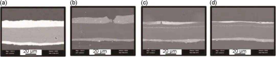 圖2通過(guò)背散射模式拍攝的SEM圖像,包括(a)原始MEA和(b)~(d)重復(fù)136次啟停循環(huán)老化后的MEA,拍攝于從陰極入口處到出口處的不同位置(上層電極為陰極)[11]