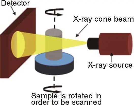 催化層孔結(jié)構(gòu)的三維表征通常以Nano-CT和FIB-SEM為主。Nano-CT的基本原理如圖3所示,X射線源產(chǎn)生的光子穿過(guò)樣品,一部分未被樣品吸收的光子將被光子探測(cè)器收集,在那里X射線被轉(zhuǎn)換成電流,用來(lái)產(chǎn)生數(shù)字圖像。通過(guò)旋轉(zhuǎn)樣品以獲得多個(gè)二維投影圖像,利用這些圖像可重建三維圖像[15]。