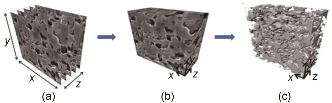 圖4FIB-SEM三維重構(gòu)過(guò)程。(a)使用FIB-SEM生產(chǎn)圖像集,(b)三維成像重建,(c)定量三維重構(gòu)和建模[20]