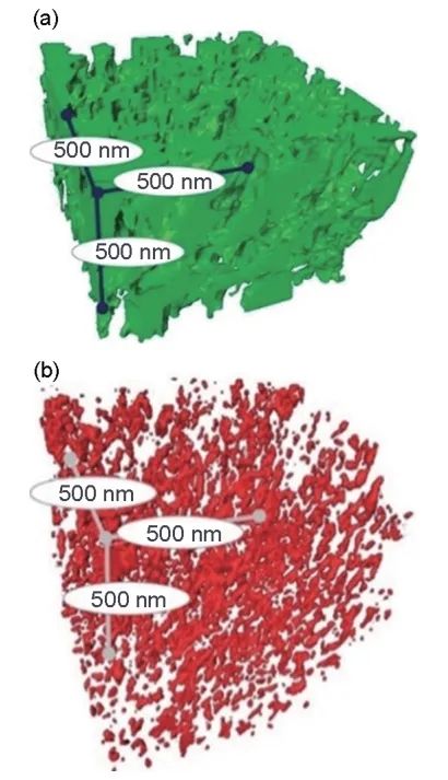 圖6常規(guī)催化層內(nèi)沉積在炭黑上的離聚物層電子斷層成像圖(藍(lán)色和淺藍(lán)色區(qū)域?qū)?yīng)于離聚物)[30]