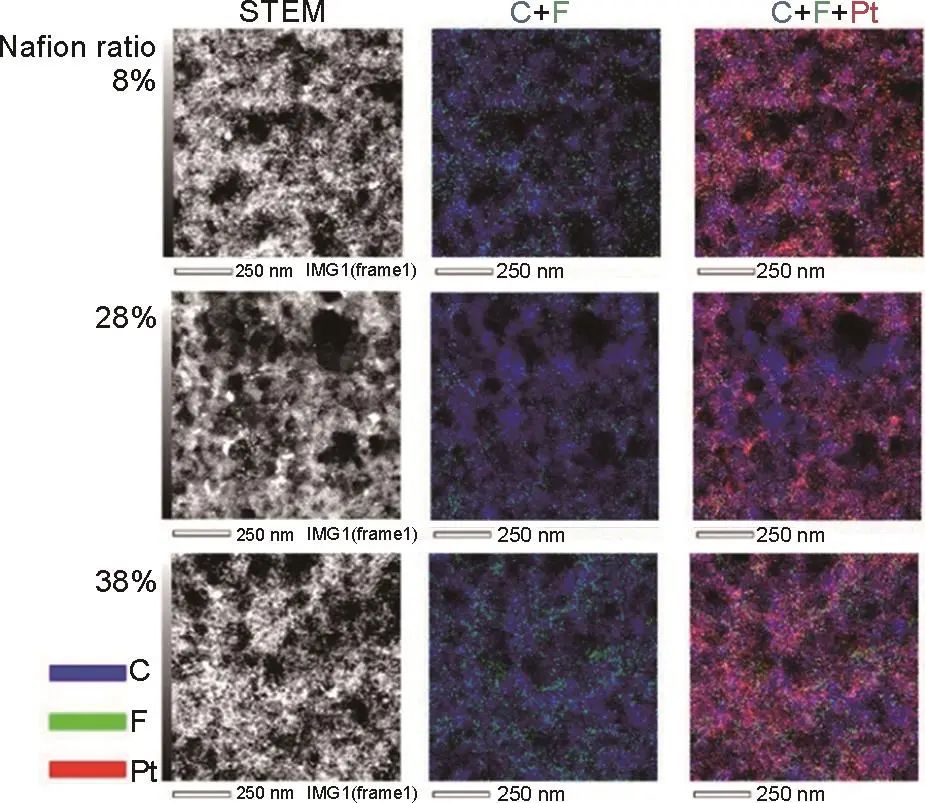 Okumura等人[23]利用掃描透射電子顯微鏡耦合X射線能譜儀技術(shù)(STEM-coupled energy dispersive X-ray spectroscopy, STEM-EDS),定量表征了催化層內(nèi)離聚物含量,如圖7所示,氟元素的EDS信號(hào)可用于確定CCL中離聚物的含量。但由于在此分辨率下檢測(cè)到的氟元素均勻地分布在圖像中,因而難以獲得離聚物在催化層內(nèi)部的分布情況。