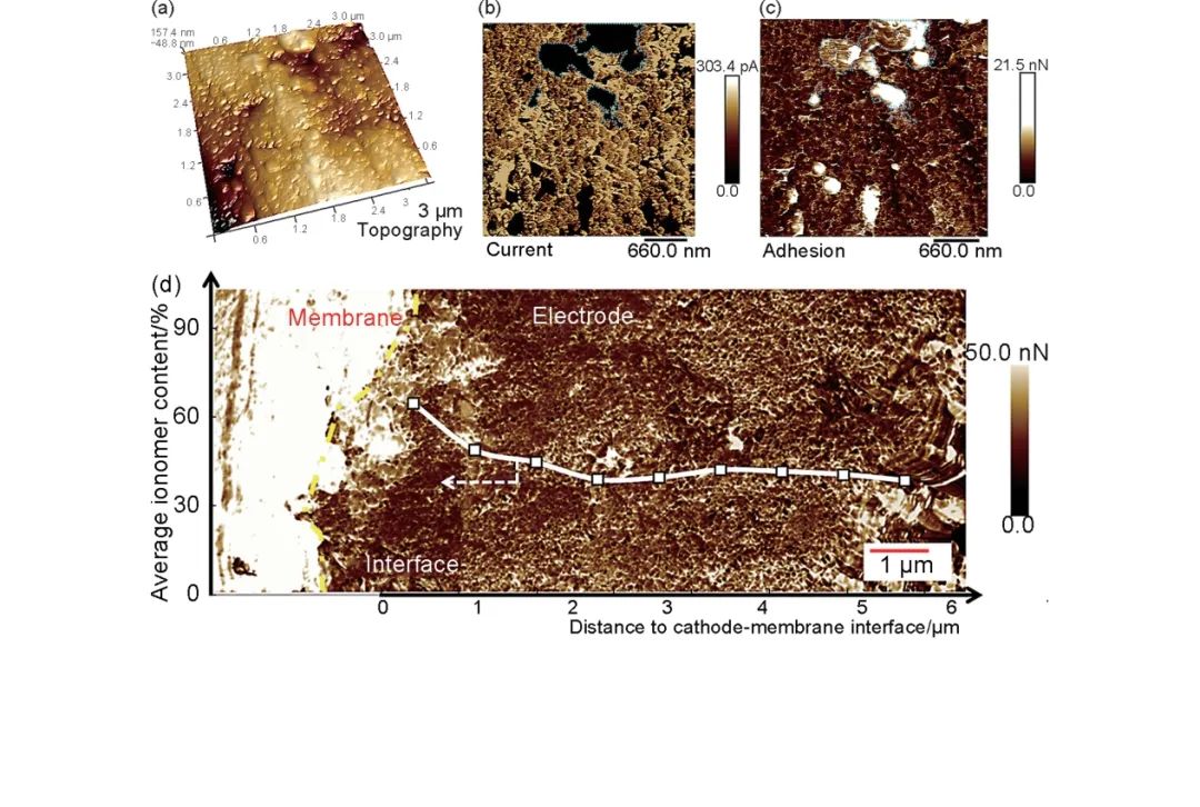 Hiesgen等人[31]則利用原子力顯微鏡(atomic force microscope, AFM),原位表征了離聚物在CCL內(nèi)的分布情況。如圖8(a)所示,僅憑三維形貌圖,人們很難區(qū)分出離聚物與Pt/C,但是利用離聚物與Pt/C之間在導(dǎo)電性[圖8(b)]和黏附力[圖8(c)]方面的差異,就可以分辨出低導(dǎo)電性和高黏附性的離聚物相(圖中虛線框內(nèi))。他們用這種方法研究了CCL內(nèi)離聚物分布的梯度,如圖8(d)所示,離聚物含量隨著膜/催化層界面距離的增加而減小,膜/催化層界面處較高的離聚物含量可能是MEA制備過(guò)程中熱壓造成的。