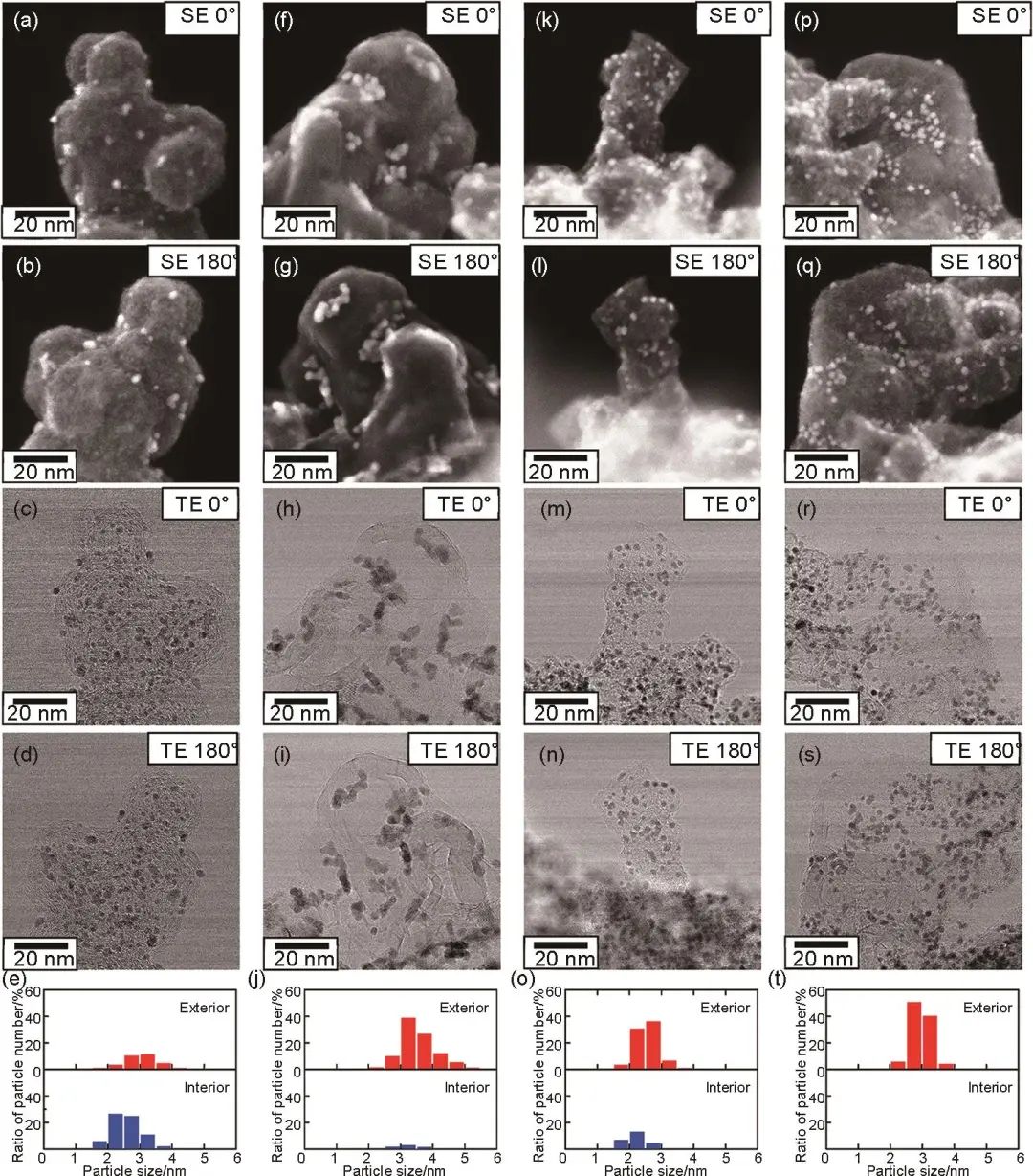 作為催化層的活性中心,Pt納米粒子的形貌與分布變化一直是研究熱點(diǎn)。由于貴金屬催化劑在TEM中的襯度較高,所以能相對(duì)容易地利用高分辨率的TEM或STEM觀察到其形貌的變化。Park等人[34]采用STEM技術(shù)分析了四種不同碳載體的Pt/C催化劑,Pt粒子在碳顆??椎纼?nèi)外的分布情況。如圖所示,由TEM圖像統(tǒng)計(jì)出載體顆粒上Pt納米粒子的總數(shù),而從特殊支架翻轉(zhuǎn)180°拍攝的兩張SEM圖上,則可以統(tǒng)計(jì)出位于碳載體外表面的Pt納米粒子數(shù)量,兩者相減可以得到位于碳載體初級(jí)孔內(nèi)Pt納米粒子的數(shù)量。