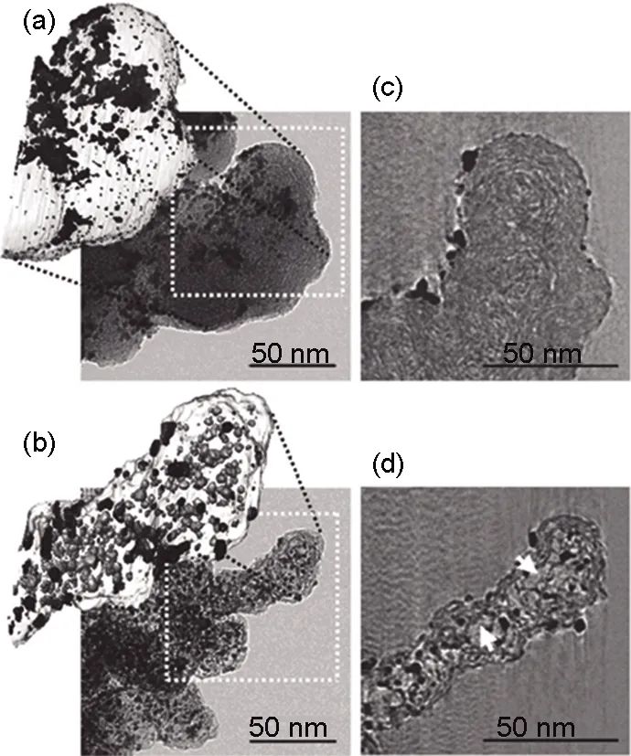 圖10(a) TEC10V50E and (b) TEC10E50E兩種不同Pt/C的三維重構(gòu)圖像和二維透射電鏡投影,(b)中灰色和黑色顆粒對(duì)應(yīng)于碳載體內(nèi)部和外表面Pt納米粒子,(c)和(d)是兩種Pt/C的切片圖像,(d)中白色箭頭所示為碳載體內(nèi)部小孔隙[37]