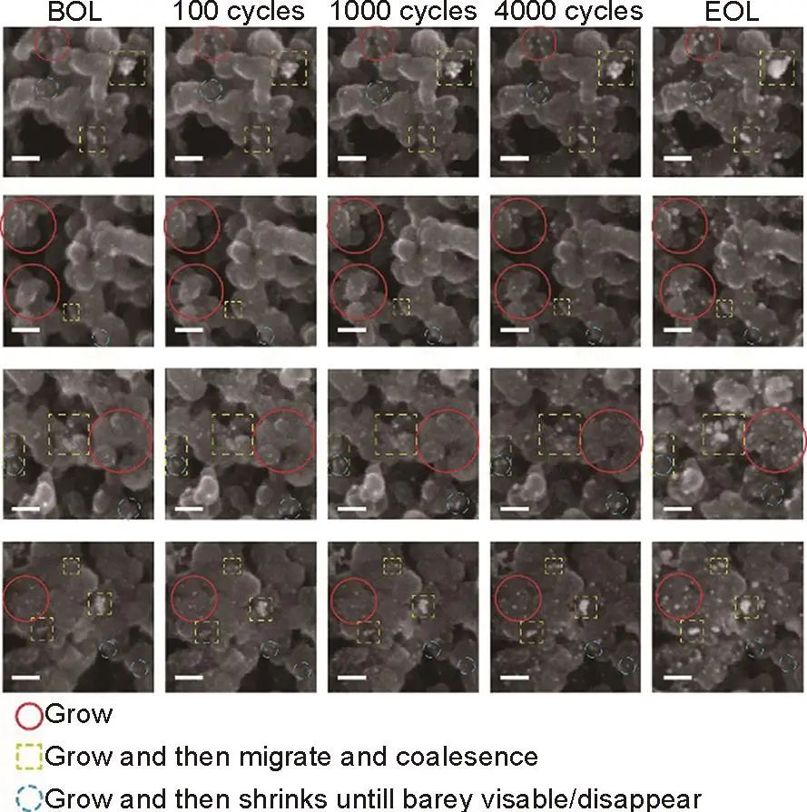 圖11代表性IL-SEM圖像顯示陰極催化層在初始狀態(tài)(新鮮)到最終狀態(tài)(總共14,000個(gè)循環(huán))的變化。紅色圓圈內(nèi)的Pt納米粒子增大,黃色虛線正方形內(nèi)的Pt納米粒子發(fā)生遷移和合并,藍(lán)色虛線圓圈內(nèi)的Pt納米粒子先增大后縮小,圖中比例尺為50 nm[40]