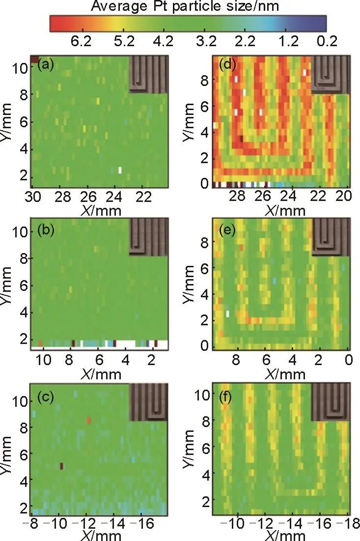 圖12在1 cm × 1 cm區(qū)域內(nèi)的Pt納米粒子尺寸分布圖,(a)加速老化前空氣出口處;(b)加速老化前流道中部;(c)加速老化前空氣進(jìn)口處;(d)加速老化后空氣出口處;(e)加速老化后流道中部;(f)加速老化后空氣進(jìn)口處。插圖為對(duì)應(yīng)流場(chǎng)幾何形狀[41]
