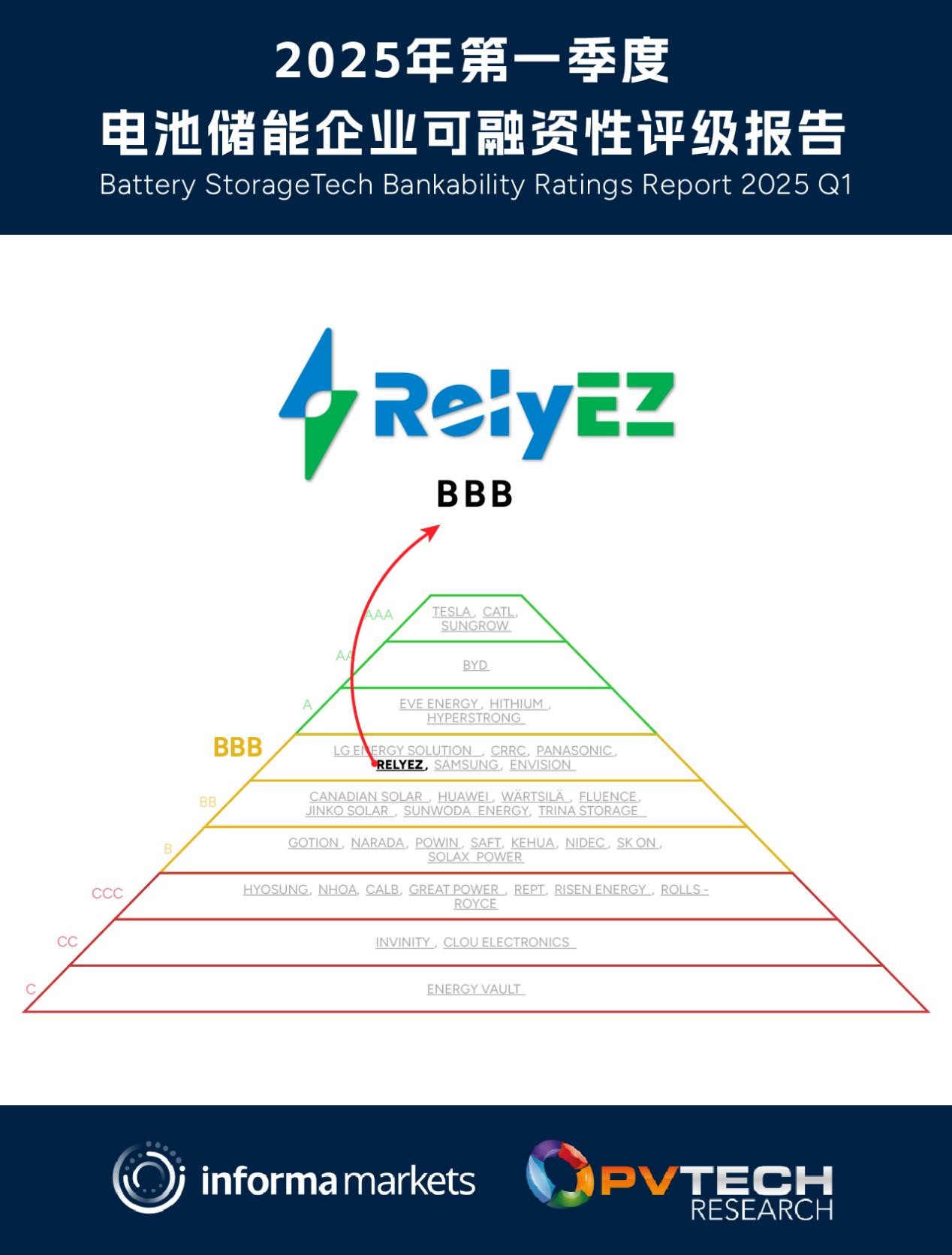 中國儲能網(wǎng)訊:近日,國際權(quán)威研究機構(gòu)Informa Markets與PV Tech Research聯(lián)合發(fā)布了《2025第一季度儲能企業(yè)可融資性評級報告》。在這份備受矚目的全球榜單中,遠信儲能(RelyEZ)憑借其卓越表現(xiàn),成功斬獲BBB評級。這一評級不僅是對遠信儲能技術(shù)硬實力和穩(wěn)健財務(wù)狀況的高度肯定,也再次印證了其在全球市場的金融信譽與項目可靠性獲得了國際權(quán)威認可。