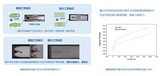 (圖示)疊片和卷繞的區(qū)別,左邊的圖,一個是它的空間利用率,第二個是硬力。右邊的圖是我們做了相應(yīng)循環(huán)之后的CT掃描,左邊是卷繞,兩個機(jī)組,在循環(huán)末端幾組有褶皺,邊緣有撕裂,這樣一個是局部發(fā)熱,內(nèi)部析鋰,右邊是整個疊片界面比較良好。