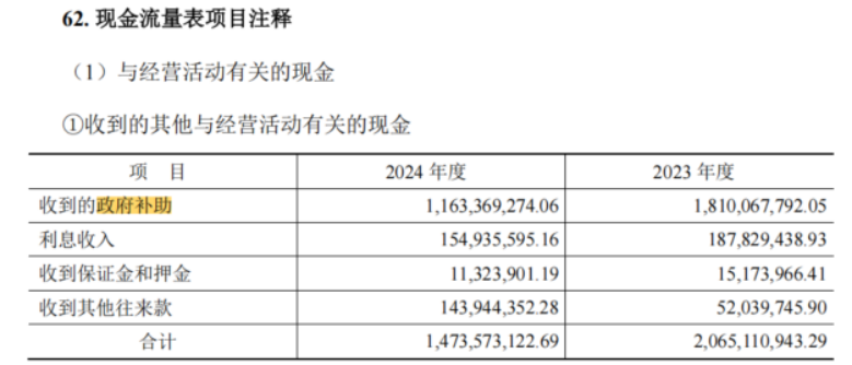 從下表可以看到經(jīng)營活動(dòng)收到的政府補(bǔ)助現(xiàn)金為11.63億元,較去年同期減少6.47億元,進(jìn)一步驗(yàn)證了政府補(bǔ)助的收緊趨勢(shì)。