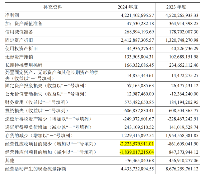 2024年,公司經(jīng)營性應(yīng)付項(xiàng)目減少了18.39億元(現(xiàn)金流表中為-18.39億元,負(fù)值表示應(yīng)付款減少,實(shí)際支付現(xiàn)金增加),而2023年該項(xiàng)為增加8.47億元,對現(xiàn)金流形成正向貢獻(xiàn)。相比之下,2024年該項(xiàng)導(dǎo)致公司多流出現(xiàn)金約26.86億元,顯著加大了經(jīng)營活動(dòng)現(xiàn)金流的壓力。造成這一變化的可能原因包括:公司縮短了對供應(yīng)商的付款周期;報(bào)告期內(nèi)支付票據(jù)到期款;或是公司主動(dòng)優(yōu)化與供應(yīng)商的合作關(guān)系,以換取更有利的采購條件,雖然短期現(xiàn)金流承壓,但可能有利于長期成本控制和供應(yīng)穩(wěn)定性。