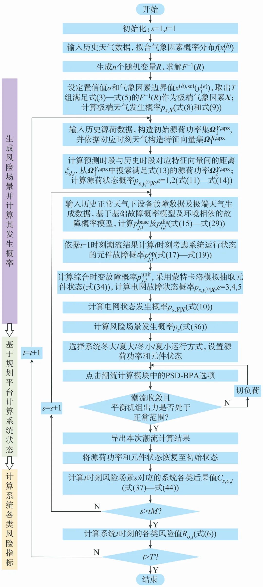 相較于針對(duì)IEEE/RTS標(biāo)準(zhǔn)系統(tǒng)的MATLAB仿真方法,規(guī)劃平臺(tái)具有:1)設(shè)備模型完備準(zhǔn)確;2)系統(tǒng)數(shù)據(jù)全面真實(shí);3)仿真時(shí)空全覆蓋;4)可修改操作等優(yōu)勢。因此,本文采用該平臺(tái)風(fēng)險(xiǎn)后果進(jìn)行模擬,提出一種基于規(guī)劃平臺(tái)的新型電力系統(tǒng)風(fēng)險(xiǎn)評(píng)估實(shí)用化方法,整體評(píng)估流程如5所示。