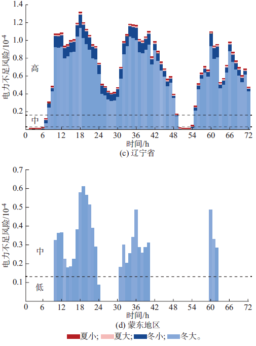蒙東電網(wǎng)受極端天氣影響小,幾乎無風(fēng)險(xiǎn),遼寧電網(wǎng)最為脆弱,整體風(fēng)險(xiǎn)高,受火電開機(jī)容量占比較高影響,暴風(fēng)雪天氣發(fā)生時(shí)其在冬大方式下各類風(fēng)險(xiǎn)尤為突出;吉林地區(qū)由于風(fēng)電開機(jī)容量較高,在冬小方式下受暴風(fēng)雪天氣影響時(shí)電壓越限風(fēng)險(xiǎn)較為突出。此外,東北所有地區(qū)均面臨較為嚴(yán)重的靈活性不足風(fēng)險(xiǎn)。