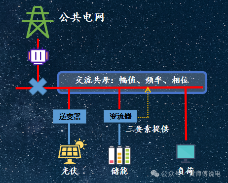 既然提到穩(wěn)定,那就和光伏沒啥關(guān)系了,所以一般此時(shí)的交流母線三要素是由儲(chǔ)能系統(tǒng)來提供的,儲(chǔ)能變流器的工作狀態(tài)就不叫跟網(wǎng)了,而是構(gòu)網(wǎng)。