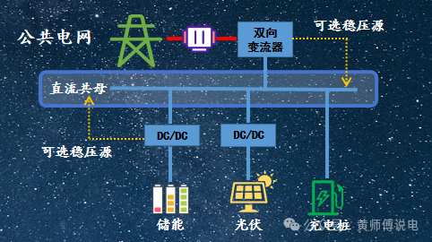 這個(gè)雙向變流器和儲(chǔ)能系統(tǒng)的雙向變流器不同的是,其直流側(cè)的接入的單位會(huì)多一些,因?yàn)橹辽僖泄夥M件、儲(chǔ)能電池組以及直流負(fù)載。
