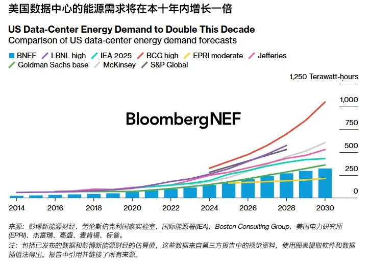 彭博新能源財(cái)經(jīng)預(yù)計(jì),到2035年,美國數(shù)據(jù)中心的電力需求將增加逾一倍,總電力負(fù)荷從2024年的34.7GW增加至78.2GW。隨著數(shù)據(jù)中心利用率提高,能源消耗將更快加速增長。美國數(shù)據(jù)中心每小時(shí)平均電力需求將幾乎增長兩倍,從2024年的16.2GWh增長到2035年的49.1GWh。