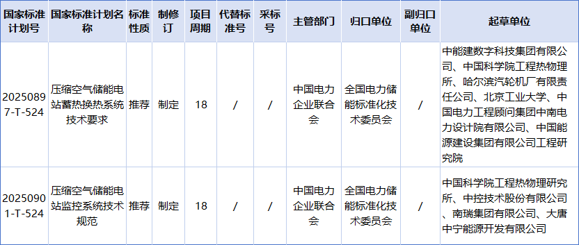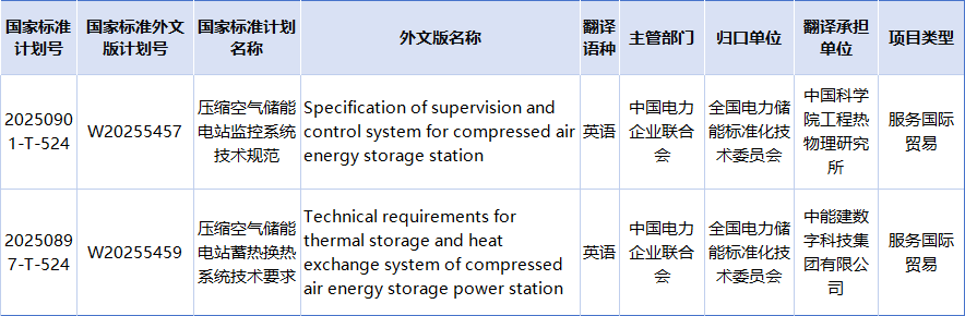 本批推薦性國家標準同步下達標準外文版計劃共計33項,全部為英語。以上兩個壓縮空氣儲能相關標準均在其中。