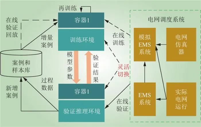 3)可靈活支持開發(fā)訓(xùn)練、驗(yàn)證推理環(huán)境需求,以及離線、仿真在線、運(yùn)行系統(tǒng)在線驗(yàn)證模式。訓(xùn)練環(huán)境和推理環(huán)境無(wú)本質(zhì)不同,只是前者要求的配置較完整,以提供全過(guò)程支持,后者則可輕量化部署,側(cè)重于以(接近)實(shí)際場(chǎng)景獲取AI模型的功能、性能驗(yàn)證數(shù)據(jù)。對(duì)于類似在線驗(yàn)證的需求,可通過(guò)引入電網(wǎng)仿真器、接入在線運(yùn)行系統(tǒng)等方式實(shí)現(xiàn)。
