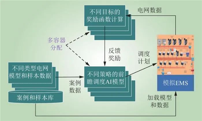 1)解耦了樣本數(shù)據(jù)與AI模型的關(guān)聯(lián)性。所有案例都來(lái)自統(tǒng)一的案例樣本庫(kù),只是根據(jù)需求分別進(jìn)行了抽取和再組織。2)適應(yīng)了AI模型對(duì)框架的依賴。對(duì)不同的AI開發(fā)框架,能夠直接在平臺(tái)上或者基于鏡像的容器環(huán)境中得到支持。3)能夠輸入多種電網(wǎng)拓?fù)?、發(fā)用電曲線、災(zāi)害事件場(chǎng)景案例,對(duì)AI模型的訓(xùn)練、驗(yàn)證和遷移學(xué)習(xí)提供充分支撐。4)通過(guò)不同的容器化部署,能夠并行化進(jìn)行各種機(jī)器學(xué)習(xí)算法、多種調(diào)度目標(biāo)獎(jiǎng)勵(lì)函數(shù)的驗(yàn)證和比較。