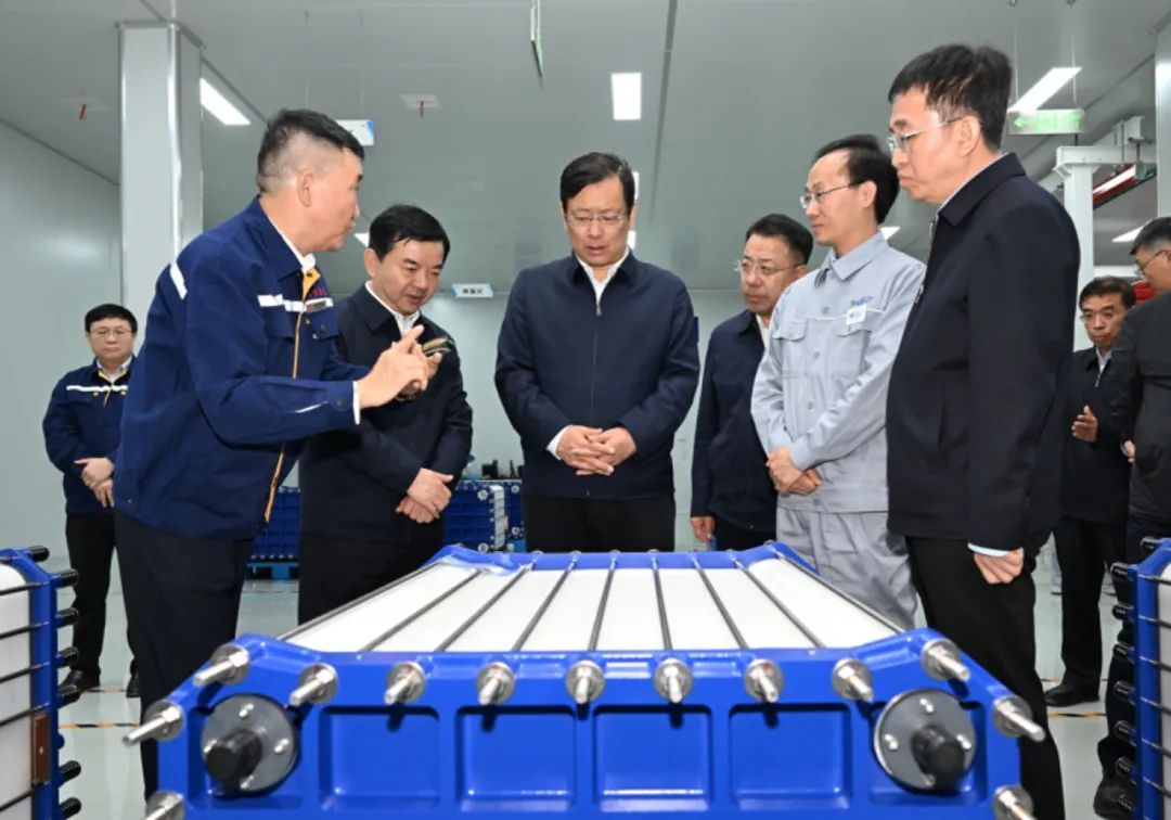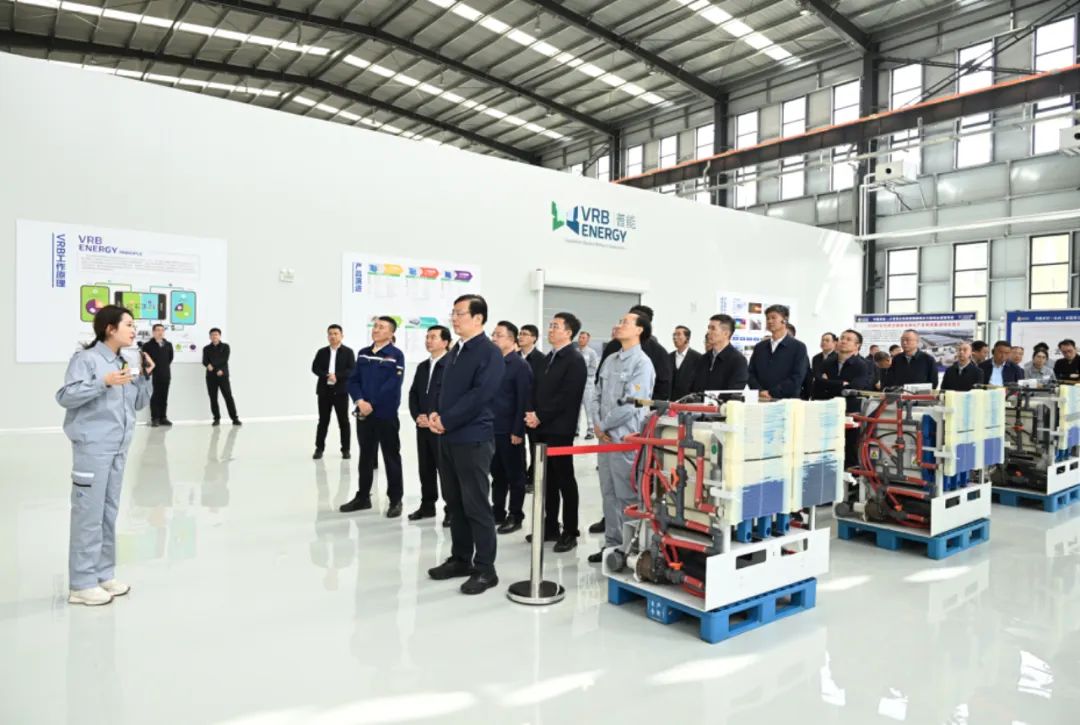 丁小強書記首先調(diào)研普能世紀(山西)新能源GW級電堆生產(chǎn)及系統(tǒng)集成項目,詳細了解全釩液流儲能電池的技術優(yōu)勢、生產(chǎn)工藝流程及市場應用前景。在參觀過程中,公司技術專家詳細介紹了全釩液流電池儲能系統(tǒng)的工作原理,其安全可靠、循環(huán)壽命長、可深度充放電、資源友好等特點引起丁小強書記的高度關注,這些優(yōu)勢使其在大規(guī)模儲能領域具有不可替代的作用,為新能源的穩(wěn)定消納和電網(wǎng)安全運行提供堅實保障。丁小強書記對全釩液流儲能技術賦能電網(wǎng)柔性調(diào)節(jié)的實踐成效給予高度認可。同時,就全釩液流儲能系統(tǒng)能量轉(zhuǎn)換效率提升、成本降低途徑等核心課題提出了期待與要求。
